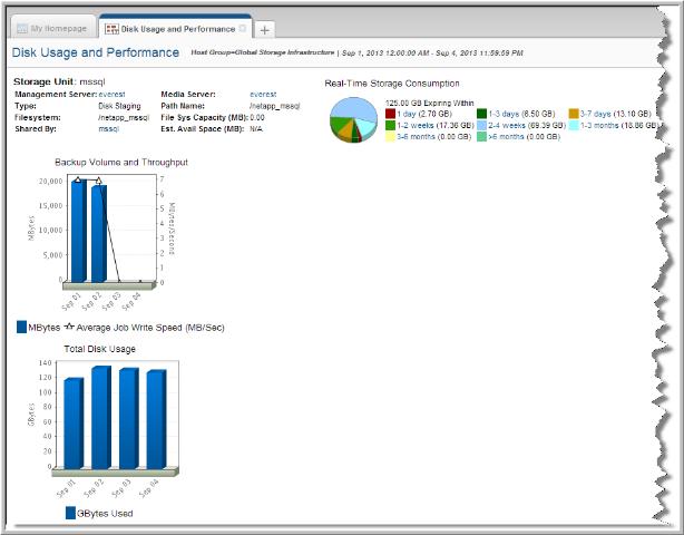 Real-Time Storage Consumption | Shows the amount of data on the Storage Unit for the selected report scope, grouped by expiration period. Mouse-over the pie slices to view the total number of backups associated with the amount of allocated storage. Click a pie slice to go to the Storage Unit Details Report, which displays a list of all the active backups that fall within the expiration period and are within the report scope. |