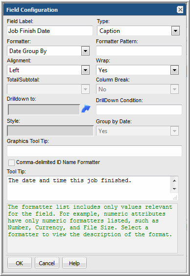 1. Double-click the Job Finish Date field in the Selected Fields panel and configure as shown: