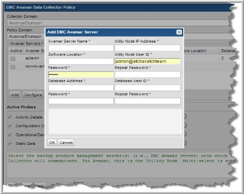 Active | Click Active to indicate the Avamar server(s) to use in the data collection policy. For Avamar, this is the Utility Node. If additional fields must be configured, the Configure Server dialog is automatically displayed when you make your selection. To manage an Avamar Server, navigate to Hosts and Domains>Hosts and Host Groups. On the Host Group Administration page, use Search to locate the Avamar server to manage. |