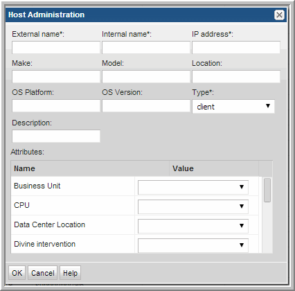 7. Enter values for all of the required fields (denoted by an *) in the Host Administration window and click OK. The field, Internal Name, needs to match the host name of the HP Cell Manager Server. Ensure you select HP Cell Manager Server as the Type. The fields External Name, Make and Model are not used by the application for anything other than display purposes.
