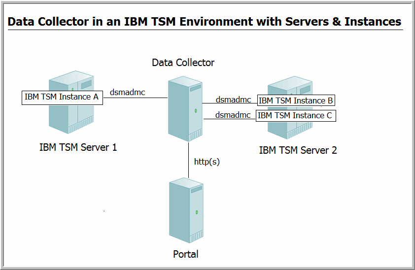 The Data Collector will use various QUERY and SELECT commands via dsmadmc to obtain its information from each separate TSM Instance. The information is then sent via http(s) to the Portal. A user can then launch a web-browser to use the Portal to see a global view of all of their TSM servers and TSM Instances.