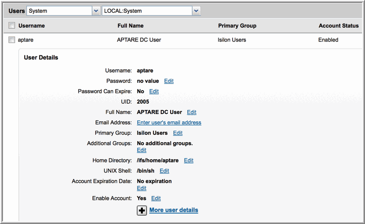 1. Using the Isilon administrative web interface, Access Management/Users, create a local user on the Isilon cluster, similar to the details shown in the following example.