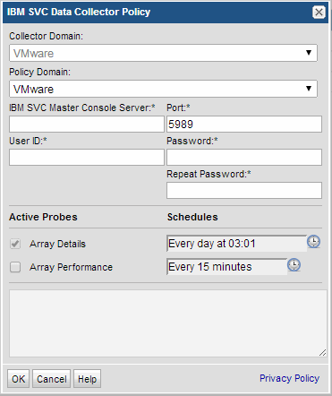 Array Performance | Click the checkbox to activate performance collection. Note that at least one collection from this array must be performed BEFORE array performance data can be collected. Also, statistics collection must be enabled via the IBM SVC user interface: Manage Clusters > Start Statistics Collection Click the clock icon to create a schedule. |