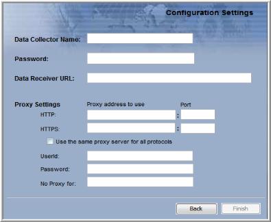 Data Receiver URL * | This is the URL the Data Collector uses to communicate to the Portal server. The format of this URL should be: http://hbsmagent.yourdomain.com It is similar to the URL you use to access the web-based Portal (http://hbsmportal.yourdomain.com). IMPORTANT NOTE: Be sure to enter the URL with the prefix hbsmagent and NOT hbsmportal. |