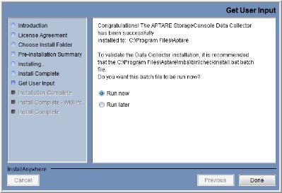 At this point, the Data Collector has been successfully installed, however, to validate the Data Collector installation, it is recommended that you run the C:\Program Files\Aptare\mbs\bin\checkinstall.bat batch file.