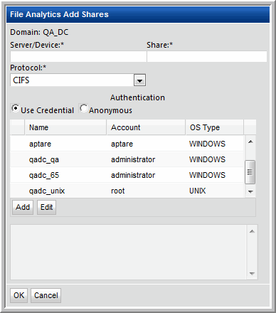 Authentication | Click either Anonymous or Use Credentials. If you are using credentials, click Add to configure the CIFS share credentials, or select an existing credential definition and click Edit. |
