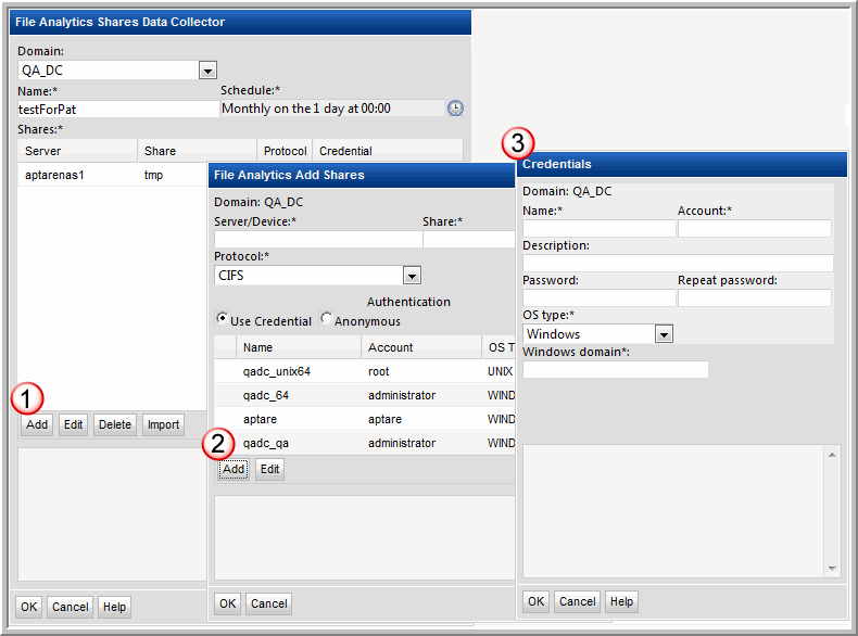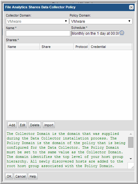 Shares* | Click Add to configure the CIFS shares that the collector will probe. Note that the Import button in this window enables bulk loading of CIFS shares. See Importing the CIFS Share Configuration. |
