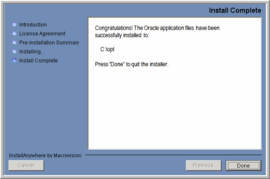 10. Click Install to start the installation of the Oracle Application binaries in the C:\opt directory on your Windows server.