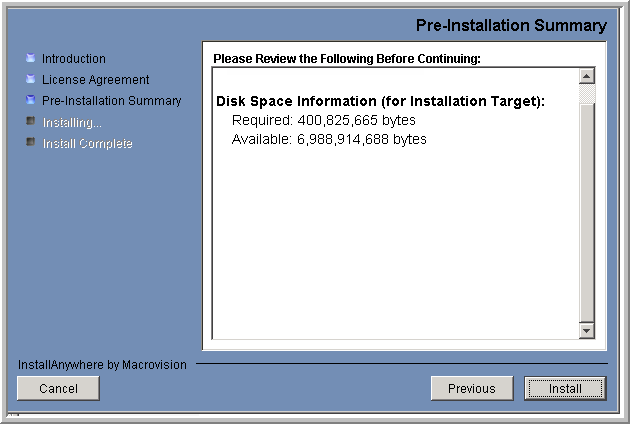 9. The next screen displays the Pre-Installation Summary. This screen summarizes the product components that will be installed and describes the available and required disk space for these components.