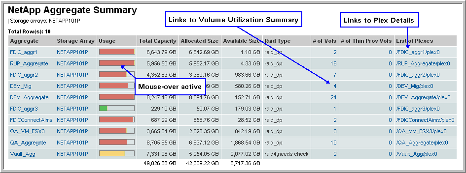 View this report for an overview of how your aggregates are configured to manage disks, RAID groups, and Plexes. The Aggregate Utilization Summary displays one row for each aggregate, with links to Volume and Plex details.