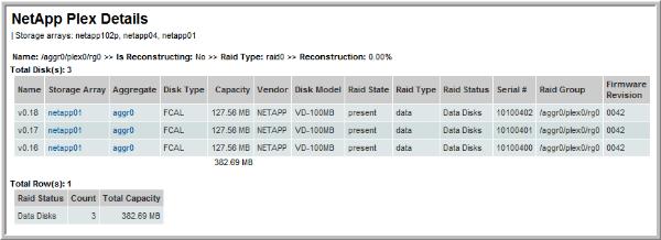 This drilldown sequence launches the Plex Details report, which displays a list of details for each of the disks in the Plex’s disk pool. Use this report to understand how the RAID groups and disks are organized and configured.