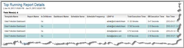 A dashboard that contains four different reports (portlets) will appear in this Top Running Reports list as four separate records. This summary does not display a row for the high-level dashboard, just the reports contained within the dashboard.