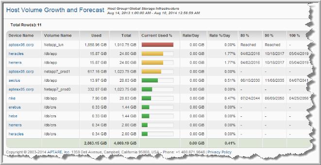 This report lists from the host perspective, all discovered file systems, capacities, growth rates and projected out-of-space conditions allowing you to monitor system (physical and virtual) volume usage and avoid service outages. The time frame for the forecast is set in scope selector when you generate a report.