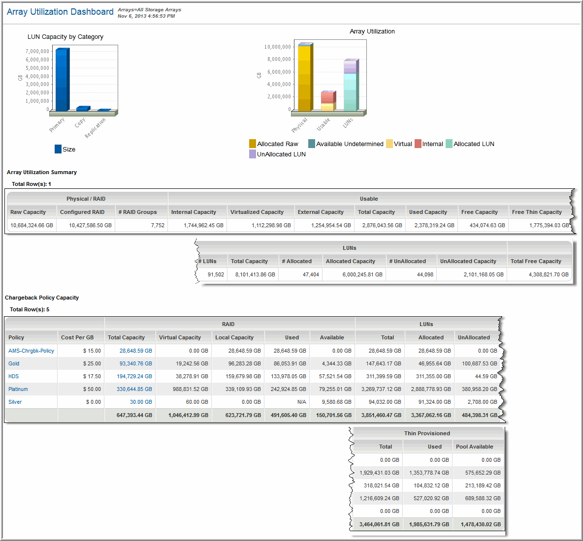 • Allocated LUN - The total storage capacity for the allocated LUNs. For HDS arrays, it includes Dynamically Provisioned capacity.
