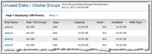 Use this report to view a list of hosts that have available space. These hosts have space from which more partitions or logical volumes can be created. This report can be used to identify storage that has been requested, but that is not being used. Then, the list can be emailed to the group that has requested the storage.