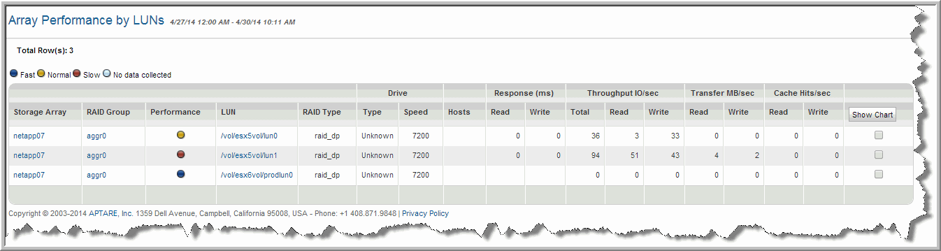 Performance | Either Fast, Normal, or Slow, based on the performance index calculation for the LUN using the last baseline profile ranges for Fast and Slow performance; takes into account the worst performance of a LUN in the RAID Group. Each of these performance states are represented by a colored dot as shown in the legend at the top of the report. |