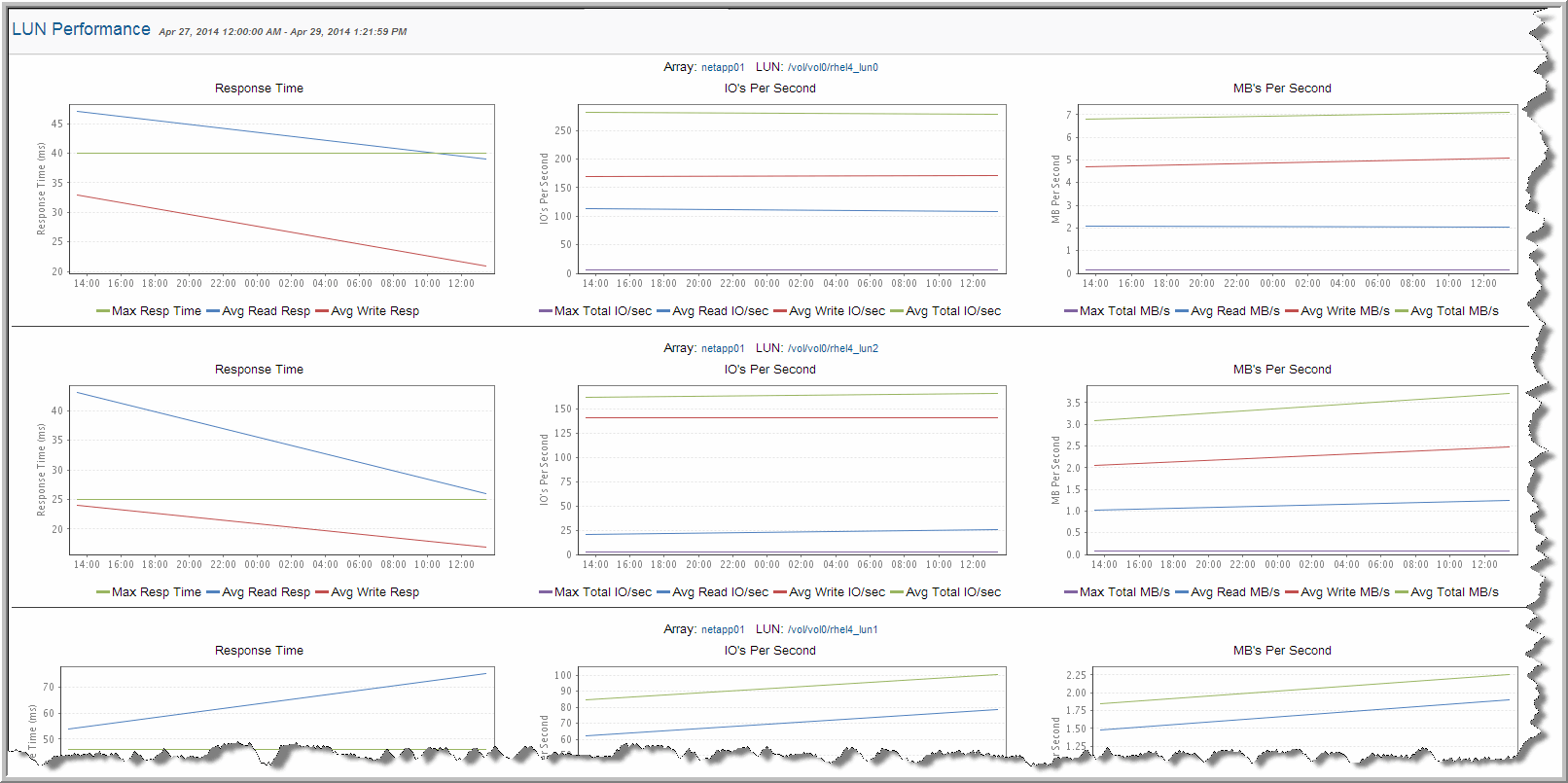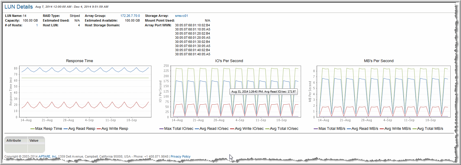 Response Time Read (ms) | Average response time (for the LUNs in the RAID Group) during the specified interval in milliseconds. Response-time metrics are not available for Dell Compellent, EMC Symmetrix, IBM SVC, or HP 3PAR arrays. |