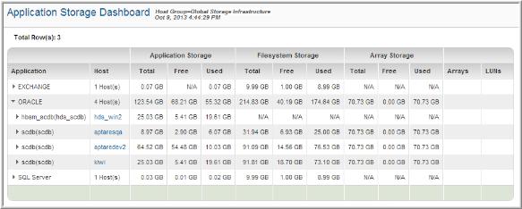 This report essentially interrogates the application to identify what storage is free. In addition, this report provides data that can be used to resolve performance issues. The table has three main sections of information: Application Storage, Filesystem Storage, and Array Storage.
