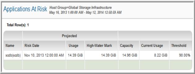 Threshold | If a threshold has been set for a particular application—that is, a database threshold—then that threshold is used to determine the risk. If there is no threshold associated with the application’s database, then other thresholds are checked, in the following sequence: Host for the associated LUN/Filesystem/Database, then Host group to which the host belongs, and then the Top-level, global host group. If no threshold settings are found at the above levels, the system defaults are used: 90% for Critical, 70% for Warning, and 30% for Low. Thresholds can be set by an administrator using Admin > Reports > Threshold Policies. |