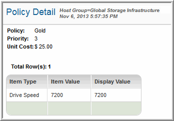 Capacity | The Hitachi Dynamic Provisioning capacity associated with this policy. Or, thin provisioned capacity for: EMC Symmetrix, EMC CLARiiON, or IBM SVC. |
