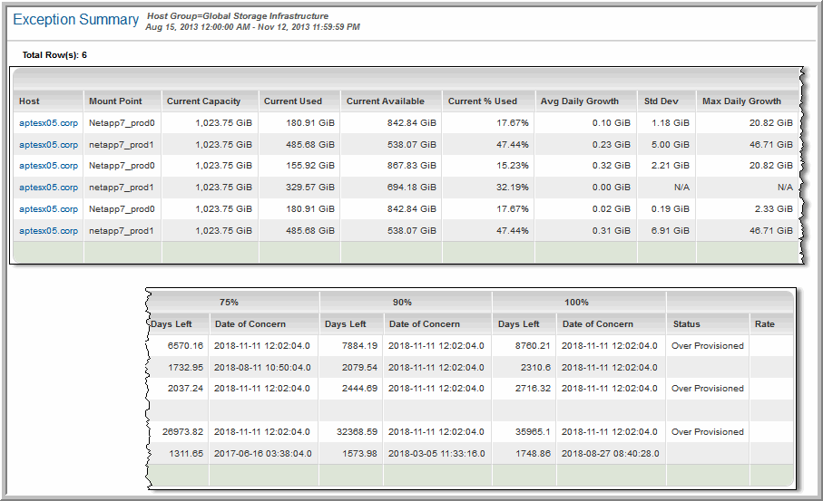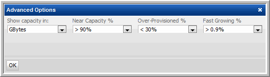 Status | Near Capacity if Current % Used > specified criteria; Over-Provisioned if Current % Used < specified criteria; Out of Space if Current Available < Avg Daily Growth; Empty if Current % Used < 5%. |
