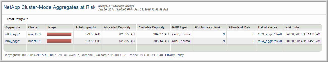 For thin provisioning, it’s important to know when host usage is about to exceed the storage that was promised. The details shown in this aggregate report can help you understand the current physical capacity status. When an aggregate is at risk—the amount of used storage in the FlexVol approaches the aggregate’s capacity—it can be re-sized to add physical disk space to the aggregate. This is for Cluster Mode arrays.