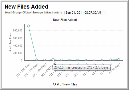 The New Files Added report provides a graphical representation of the trend of the number of files that have been added, over time, in your environment. Storage Viewer for File Analytics data collection groups the files by historic create dates and stores the metadata for these files in the Storage Viewer database for reports such as this.