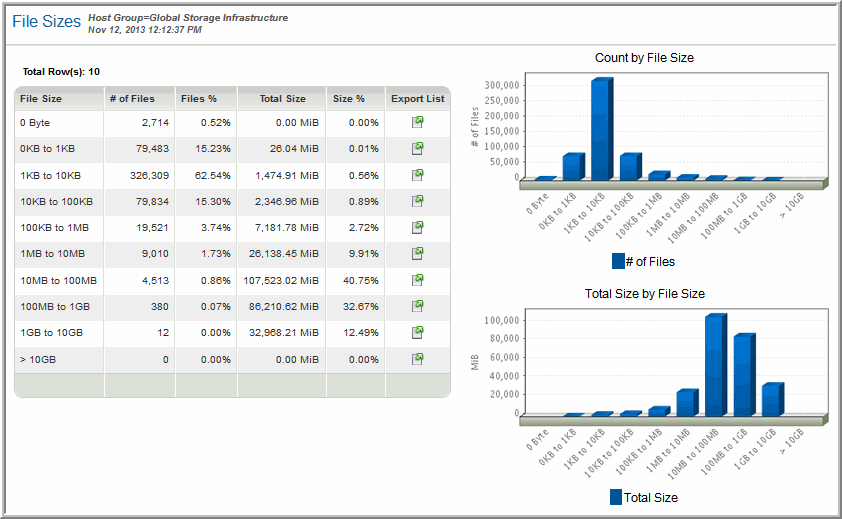 Note: A discrepancy may be noted in the # of Files shown in the File List Export output and certain reports, such as the File Sizes report. This is due to rounding used in the reports. File List Export includes all filenames profiled for the Portal, while the File Sizes report categories are at the KB level and are impacted by precision differences caused by rounding and division by 1024.