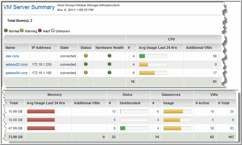 Hardware Health | Indicates the overall health of the host’s hardware: None, Unknown, Green=Normal, Yellow=Warning, Red=Alert. When filtering the report on this field, use the color. |