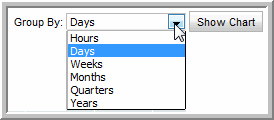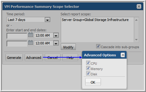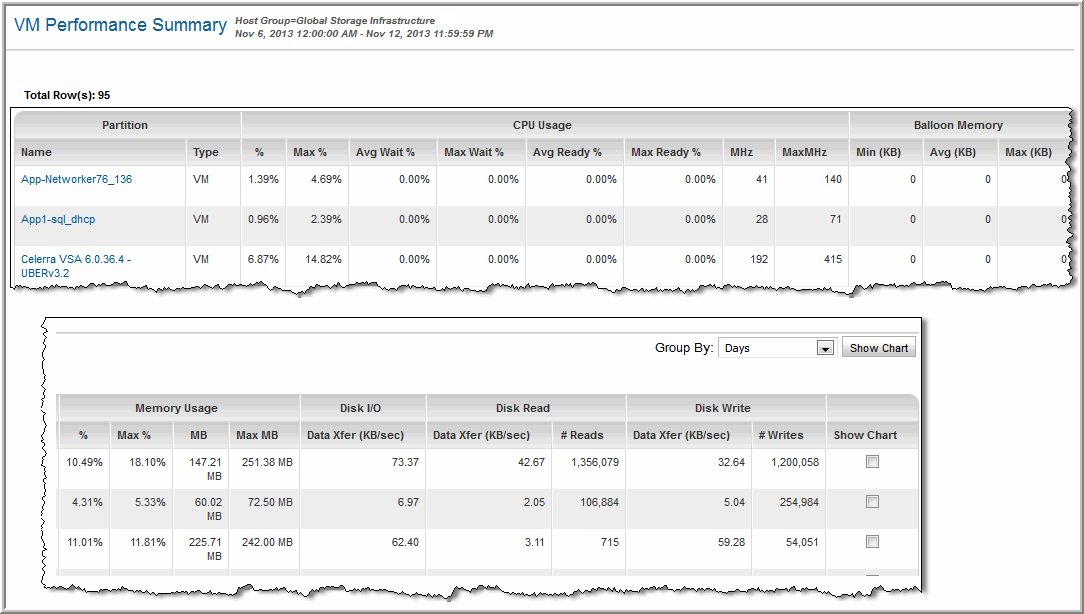 Show Chart | Check the boxes for which you want to generate charts and click Show Chart to view the VM Performance Over Time graphs. Disk Read and Write Latency is available only for ESX Hosts (not VMs). Therefore, the latency performance charts are available only for partitions of Type=Host. See also Show Chart Parameter. |