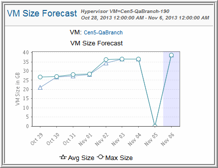 This VM report projects the growth of the VM over time, based on historical data. Mouse over the Avg and Max icons to view the values.