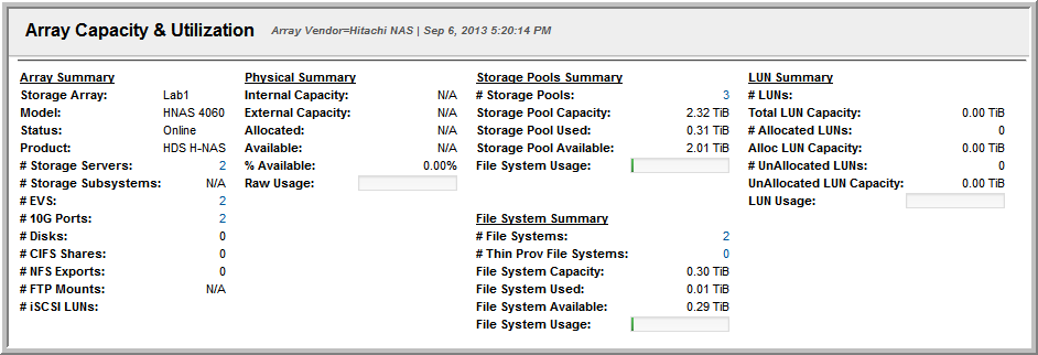 # Storage Pools | Sum of the array’s Storage Pools. Click this report to view details in the Hitachi NAS Storage Pool Summary. |