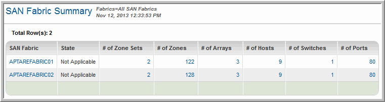 Storage Viewer for SAN Fabrics > Administration Reports > SAN Fabric Summary