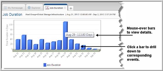 Drillable Bars in Chart | Click on any of the bar sections to go to a Job Summary Report for all corresponding events. |