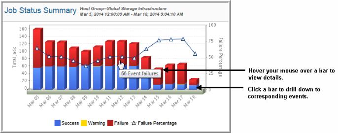 The Job Status Summary report shows a bar chart that aggregates jobs that succeeded, failed, or produced warning messages. This high-level summary provides drilldown access to the Job Summary report, where you’ll find specific status messages and scheduling information.