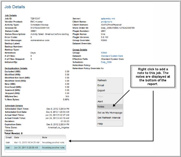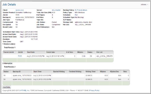 Paths and Related Jobs | The paths being backed up for the job are displayed in a comma‑delimited list. When there are multiple related jobs, each of the jobs and associated paths is displayed in the related jobs listing. Clicking on any of the related job IDs will take you to the Job Details report. |