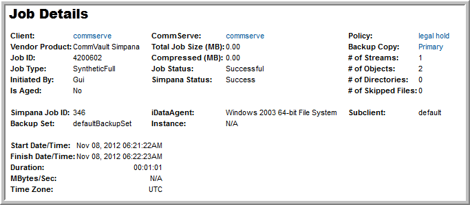 Policy | the CommVault Simpana storage policy. Links to CommVault Simpana Policy Backup Copy Details report. |