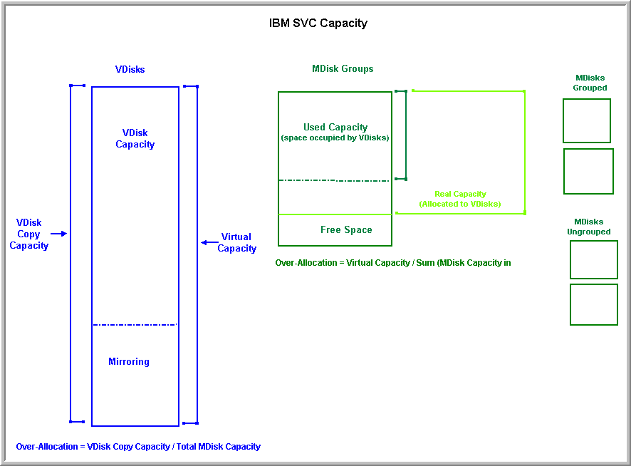 Space Available in MDisk Groups | MDisk Group total capacity minus the space allocated to VDisks. Note that some space may be reserved for use by SVC. |