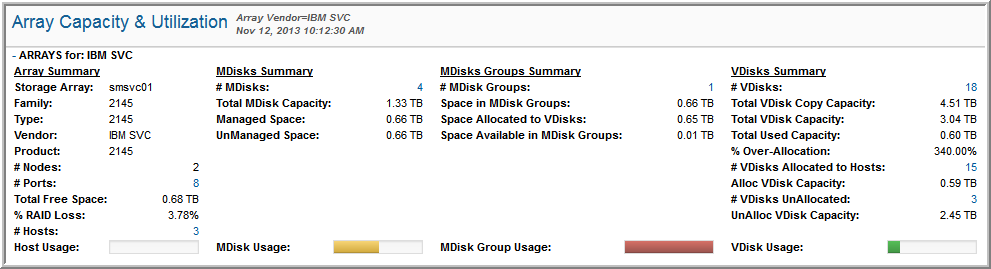 MDisk Usage | Expressed as a percentage, total capacity of the LUNs in the array that have been assigned to a host and that are not available for provisioning. |