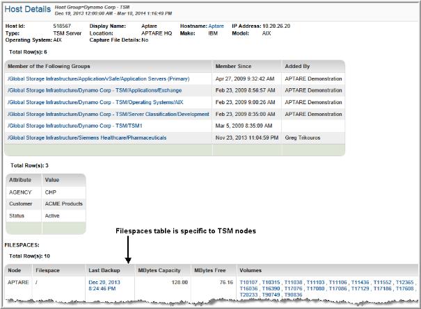 Filespaces | The filespace section at the bottom of this report provides the following data (for TSM only): Node lists the name of the physical server. Filespace lists the directory of the filespace. Last Backup provides a link to the last backup’s job details. MBytes Capacity displays the capacity of the filespace. MBytes Free shows the available space in the filespace. Volumes: Click links to access specific volumes to display the Tape Media Detail. Storage Pool lists the Storage Pools to which the Node belongs. |