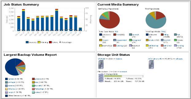 Largest Backup Volume Report | Provides a real-time snapshot of the largest server backup consumers within the report scope. Mouse‑over any of the bars or symbols on the chart to display pop-ups that provide details. Click on any section of the pie-chart to go to the Server Consumption Summary Report for a particular server. Click on the Total Servers link to go to the Server Consumption Summary report for all the servers within the report scope. |
