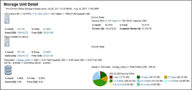 Storage Unit Usage | Shows the active backups on the Storage Unit grouped by expiration period. Click on a pie slice to go to the Storage Unit Event Details, which displays a list of all the active backups within the particular expiration period. |