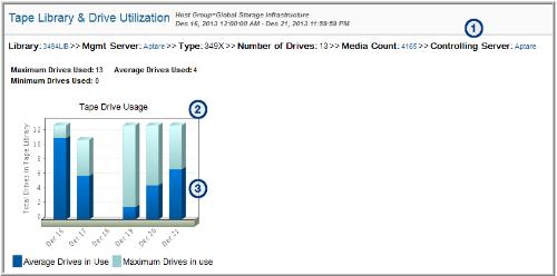 Tape Library and Drive Utilization report displays the average drive utilization against the actual drive utilization for any given time period. Often, this report is used to justify VTL purchases. Identify how many tape drives are writing and for how long. In addition, the