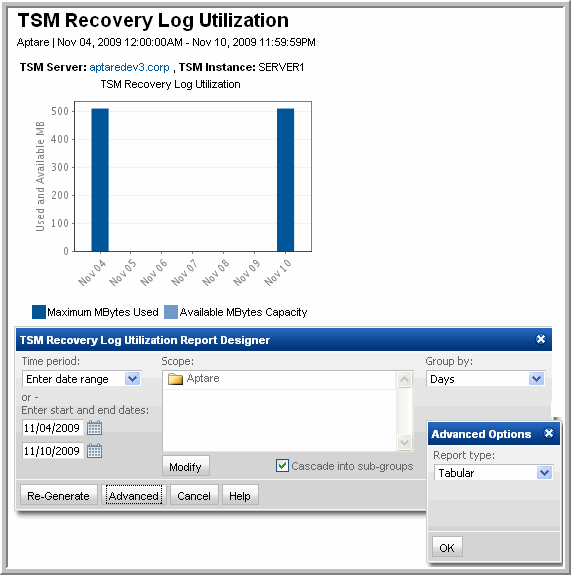 Storage Viewer for Backup > Storage Utilization Reports > TSM Recovery Log Utilization
