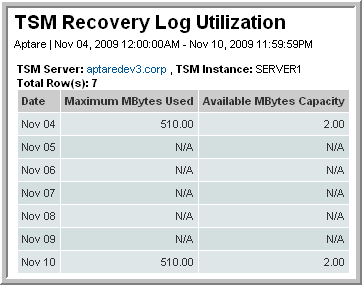 This report displays TSM Recovery Log usage—both the maximum used and the available capacity. The TSM Recovery Log contains transactions prior to TSM committing them to the database. Use this report to monitor the size of the log to prevent degradation on the TSM server.