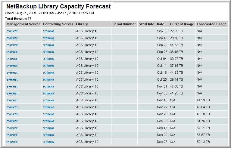This report can display either a bar chart view or a tabular report of library capacity, current usage, and forecasted usage. In the scope selector, select display as Chart or display as Table.