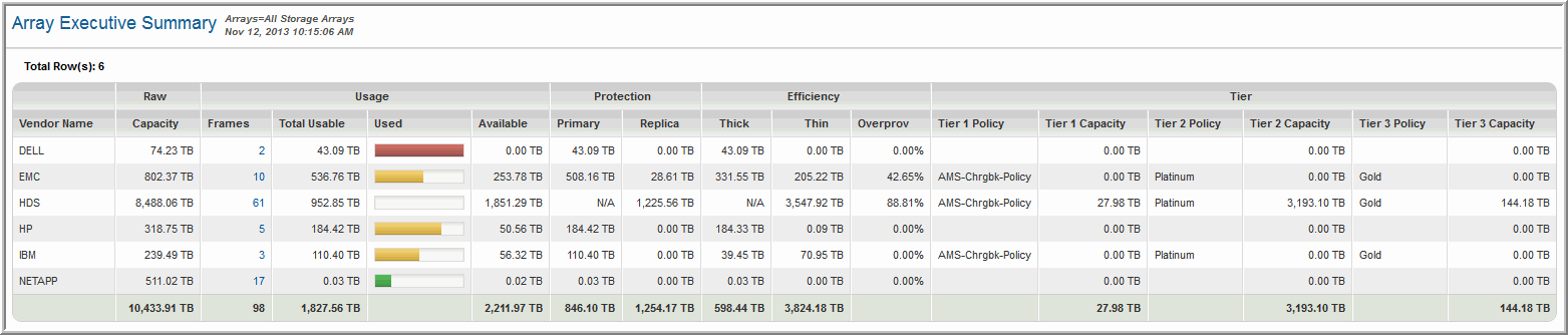 Usage: Frames | The number of arrays for this vendor. Click on the link to view the Array Utilization Summary, which displays additional information for each array. |