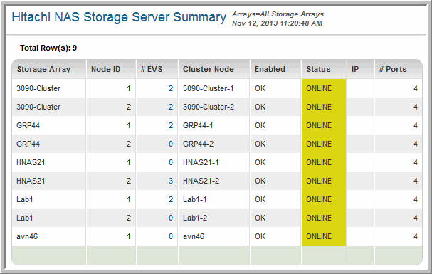This report lists all of the Hitachi NAS (HNAS) Storage Servers configured as of the last data collection cycle. There will be a line item for each Storage Server in the scope of the report. Multiple filers are possible. Each Cluster can have multiple Storage Servers that manage the block storage.