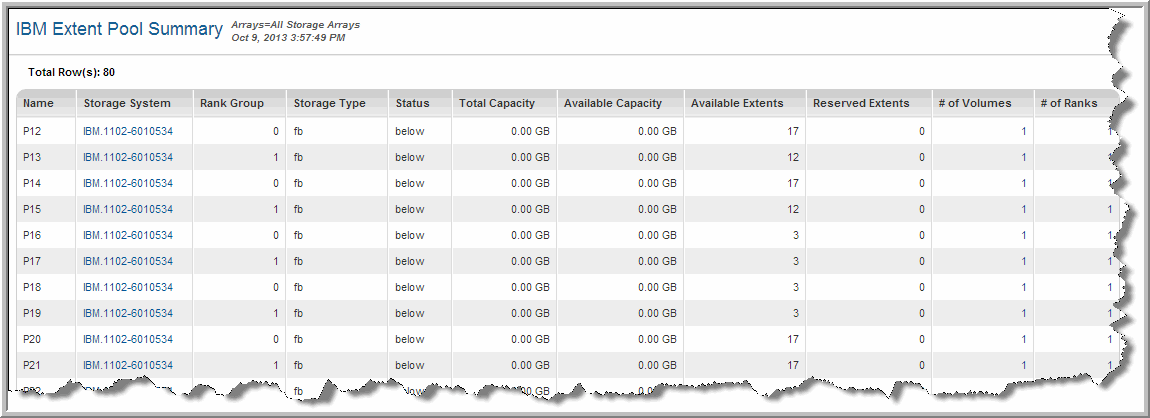 Storage Viewer for Capacity > Array Capacity & Utilization > IBM Extent Pool Summary