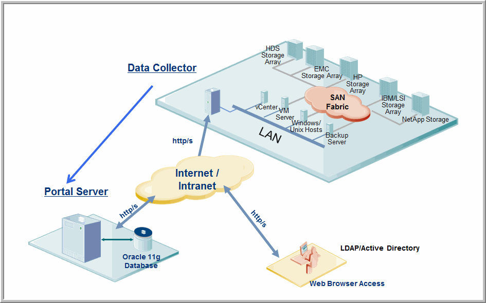 , the Data Collector uses storage array mechanisms specific to each vendor’s storage system (for example, HDS, IBM, EMC Symmetrix, EMC CLARiiON, and NetApp). In addition, Host Resources data is acquired, as described in